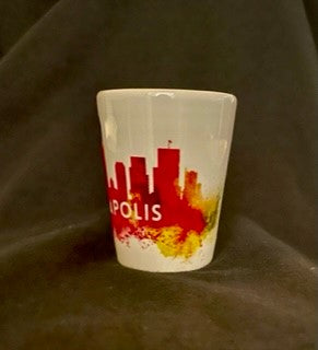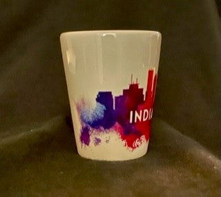 Ceramic shot glass, with a water-colored, abstract Indianapolis cityscape design. By Lantern Press.