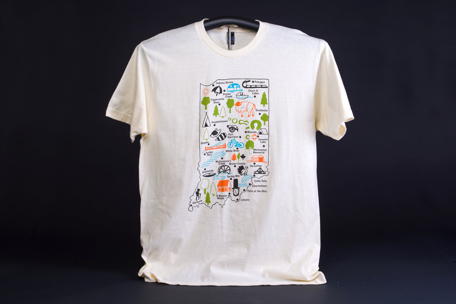 25 Official State Parks of Indiana, in four bright colors on natural colored t-shirt, 100% cotton, from Sunday Afternoon Housewife, Indianapolis, IN. Specify S-3XL.